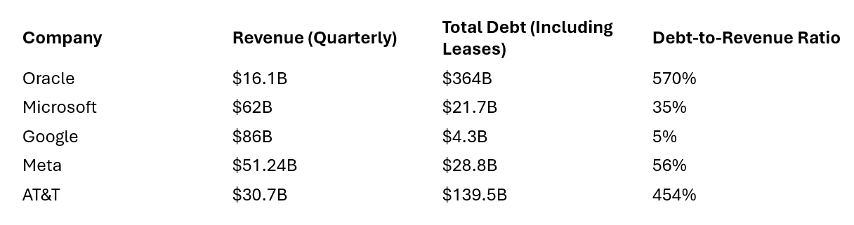 While Oracle’s cloud “revenues” are up 34%, the debt level went up by 44%, indicating that Oracle is going far deeper into debt. Just for comparison I compared this massive debt load with that of Microsoft, Meta, Google, and just for kicks, AT&T.